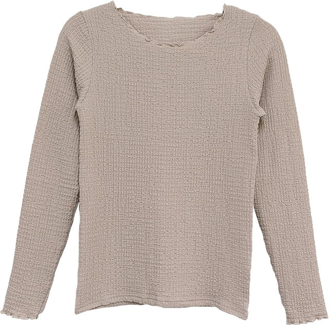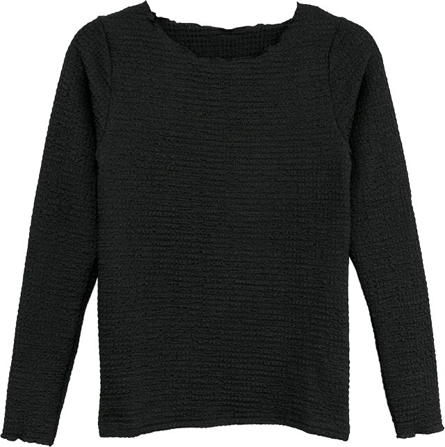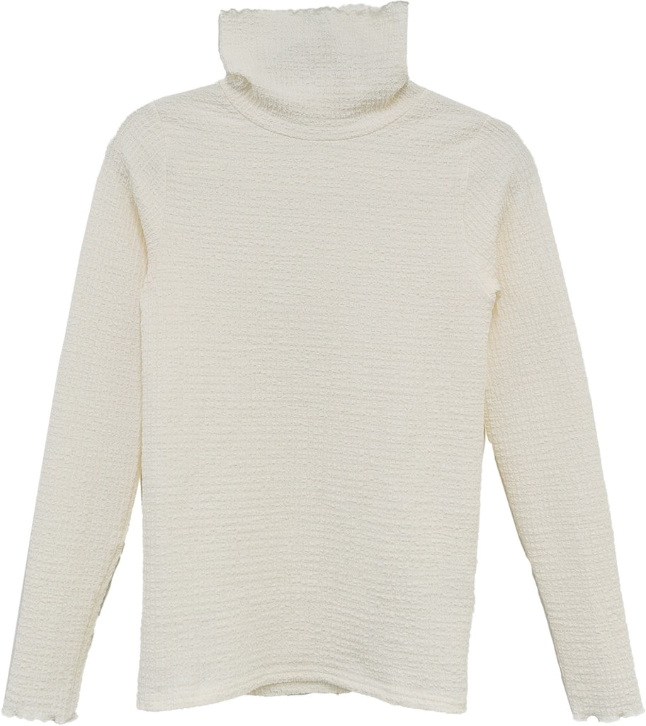 襟や袖口のメローフリルがカジュアルになりすぎない映えトップス。