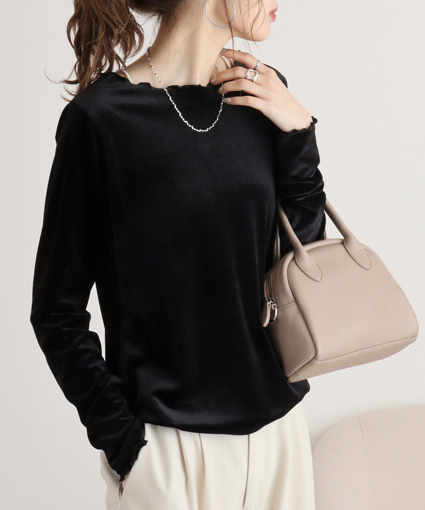 ベロア素材の光沢感と柔らかな肌触りが魅力の大人のカジュアルアイテム。メロー仕上げのディテールがさりげなく女性らしさを演出し、クルーネックデザインで首元をすっきりと見せます。