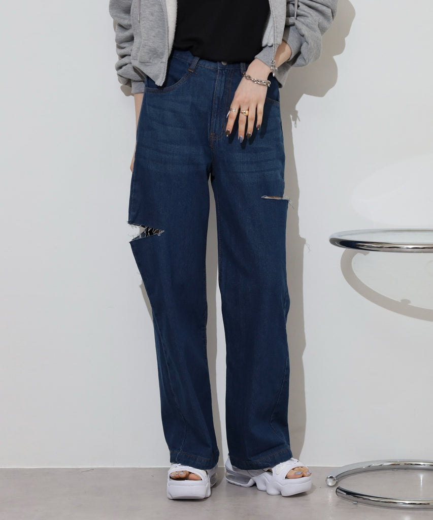 さりげない肌見せが大人の抜け感を演出する「デニムダメージストレートパンツ」。