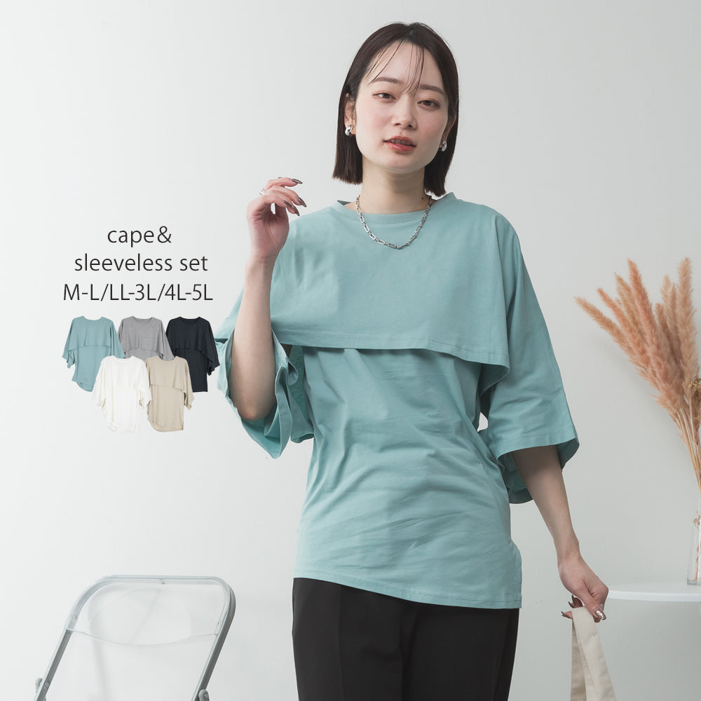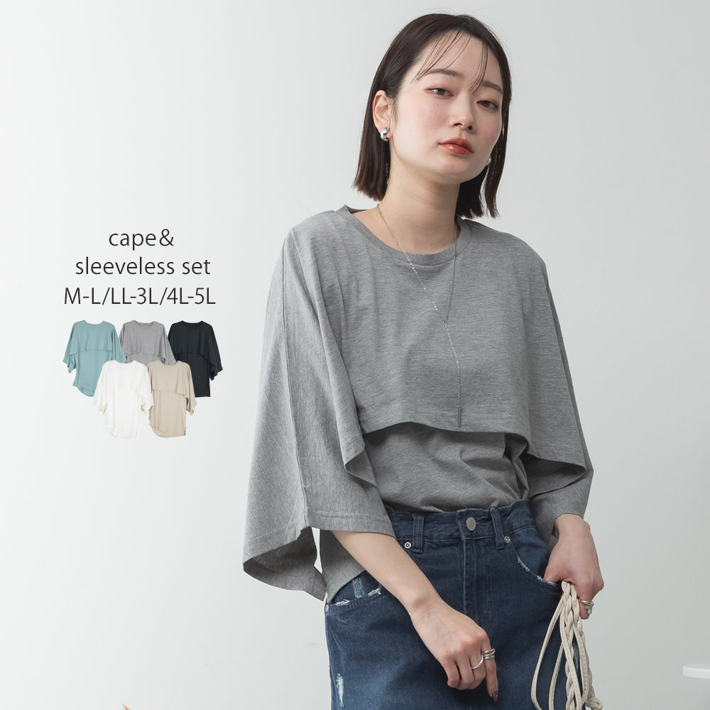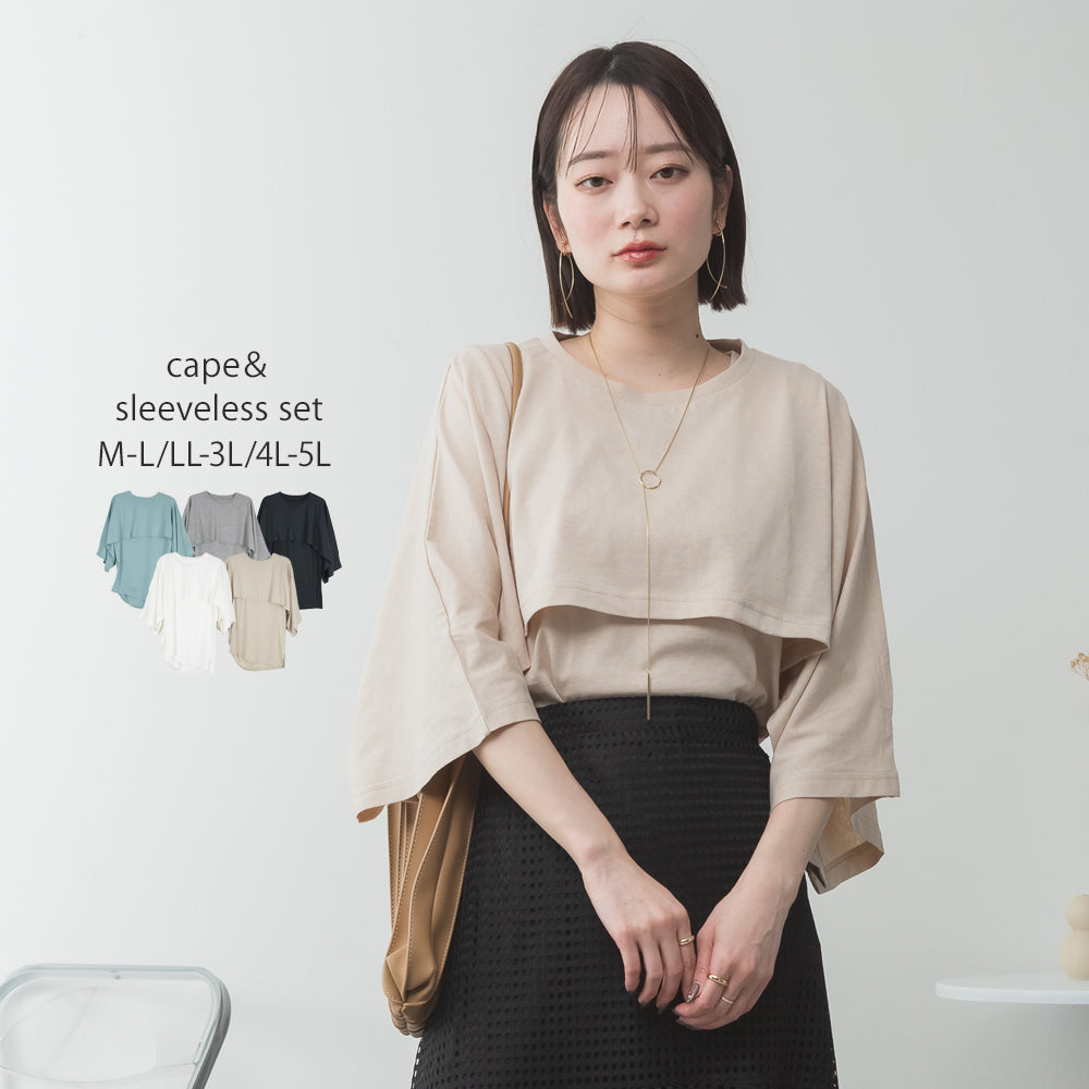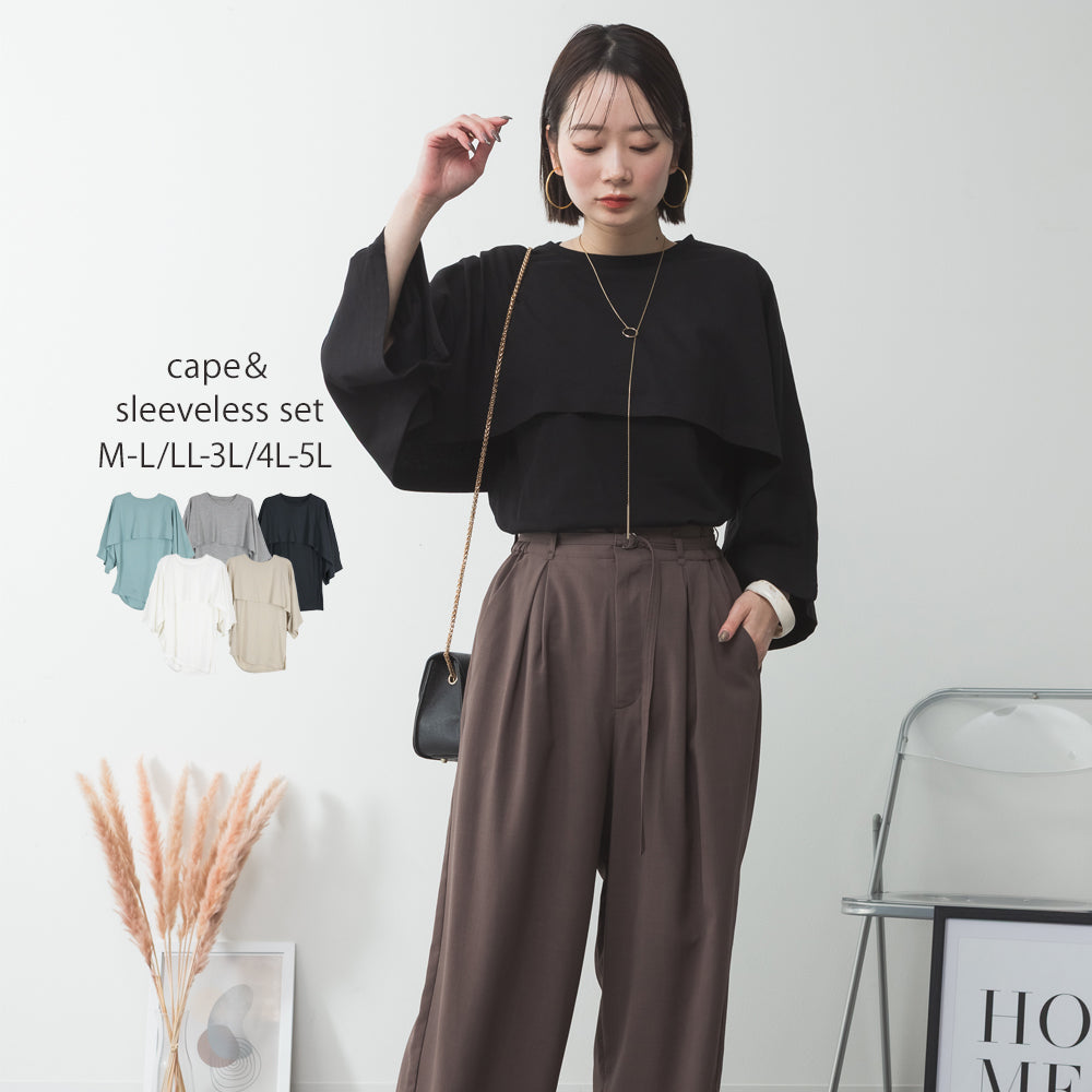 中のタンクトップは一枚でもインナーとしても良し、ナチュラルケープはお持ちのカットソーやワンピースとあわせるのも◎