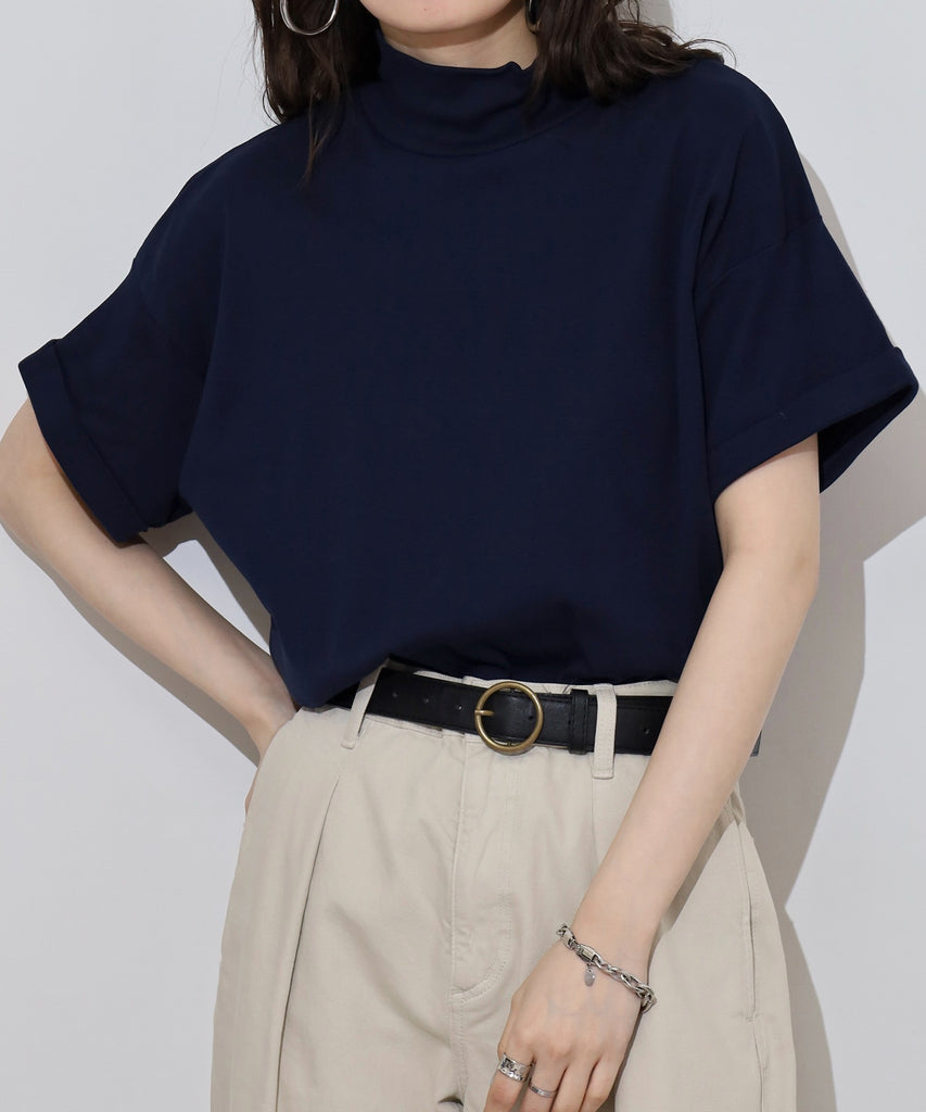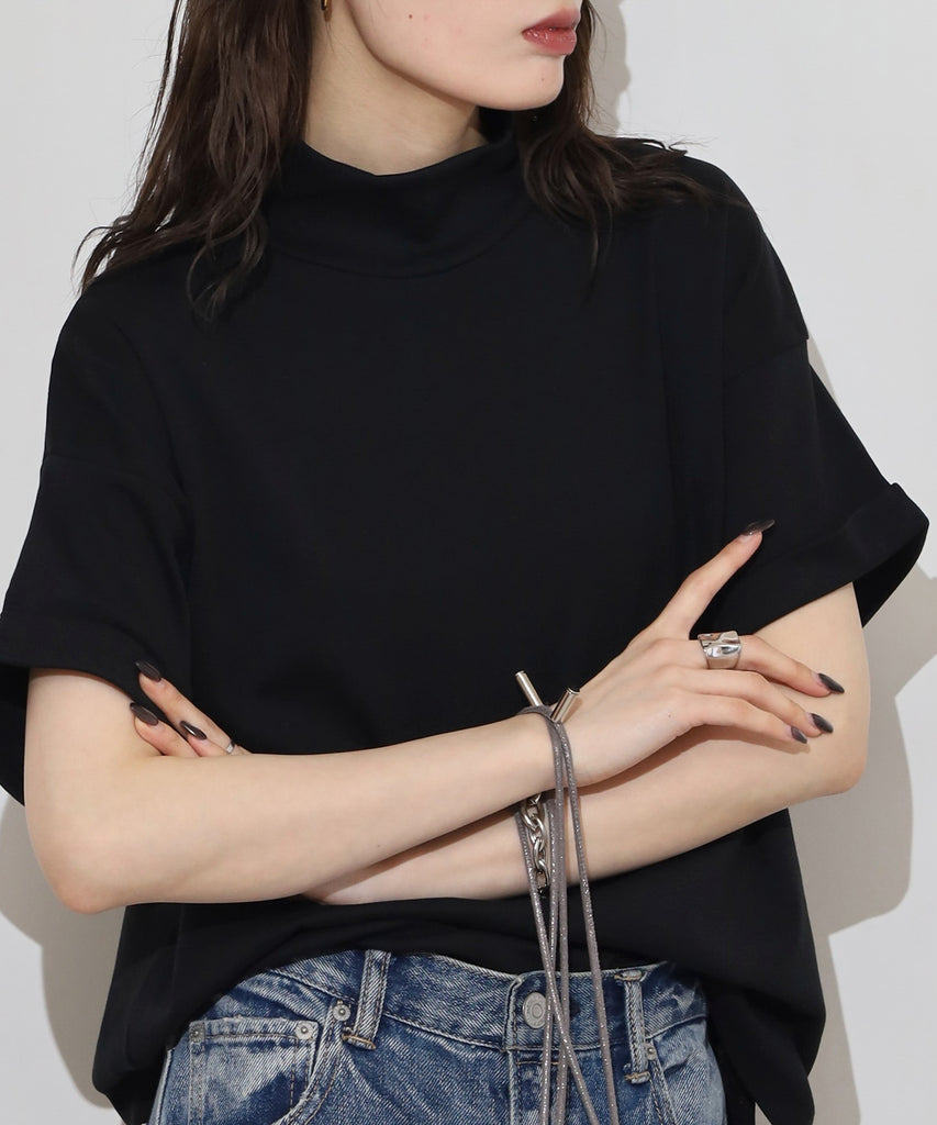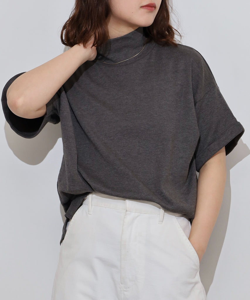 程よい高さのハイネックデザインが首元をすっきりと見せ、1枚での着用はもちろん、レイヤードスタイルにも活躍。