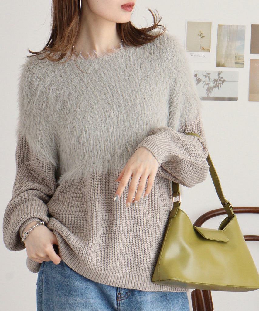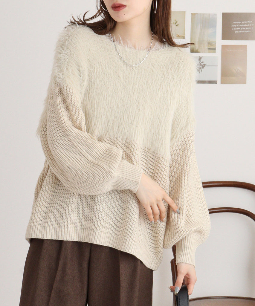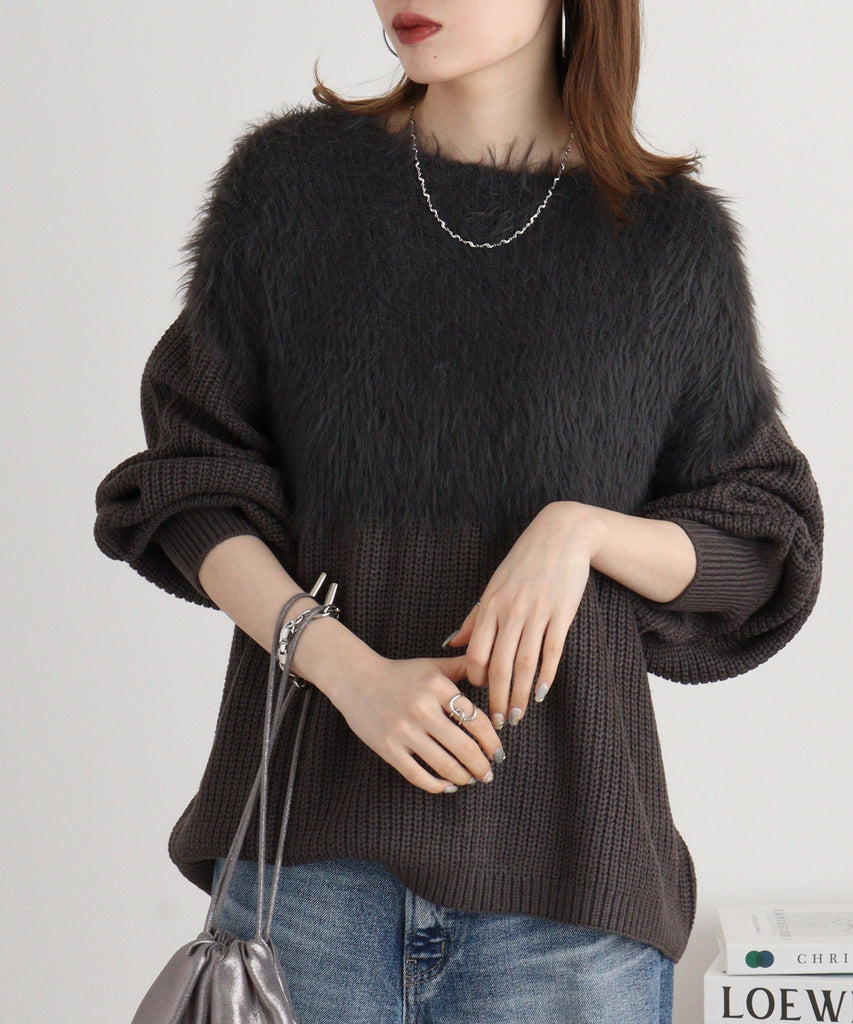 ふんわりとしたフェザーヤーン素材が特徴のニットトップス。切替デザインがシンプルながらも立体感を生み出し、コーディネートにさりげないアクセントをプラス。