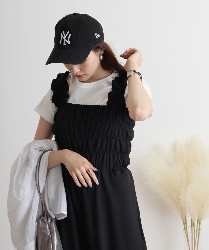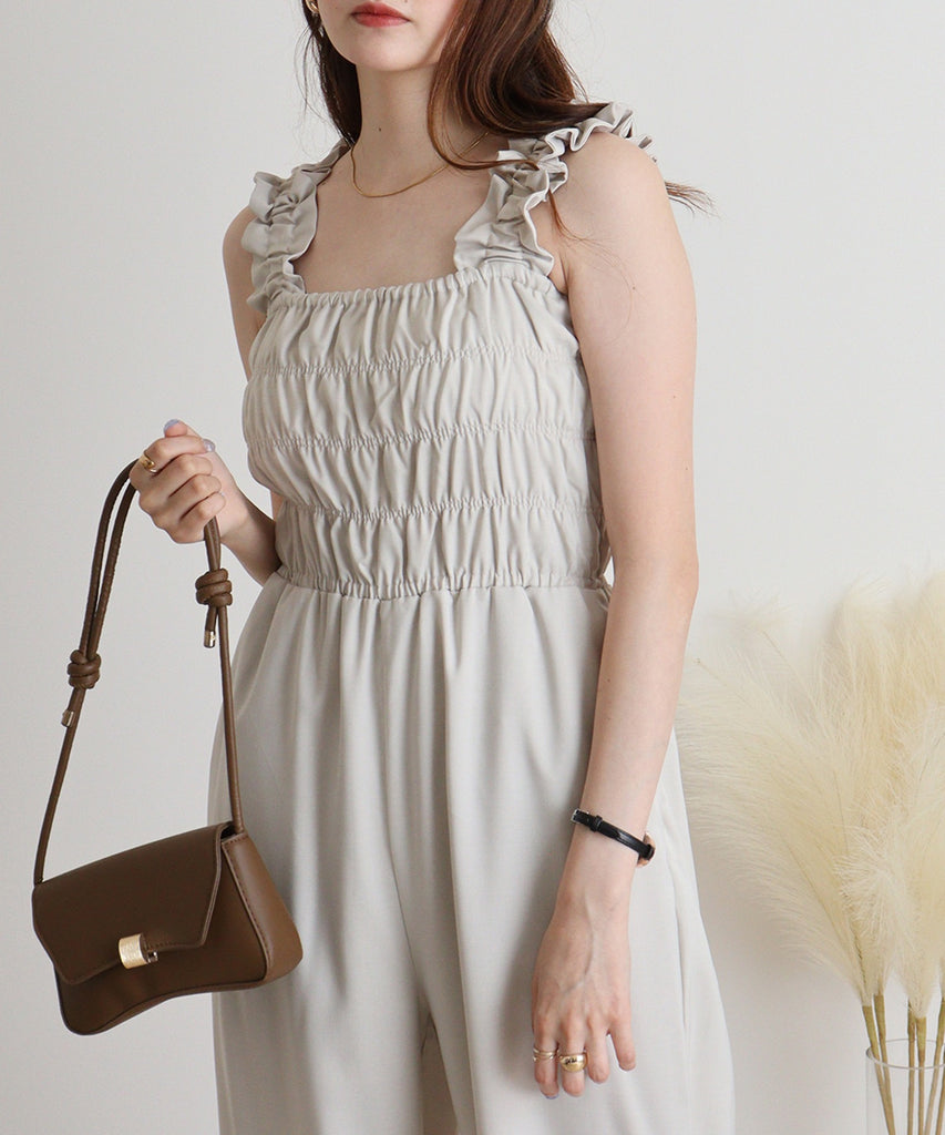 ヘザーエステルツイル素材を使用したシャーリングサロペットです。