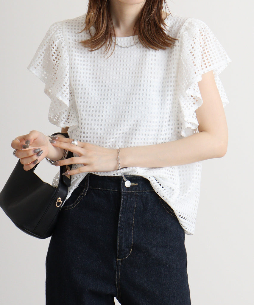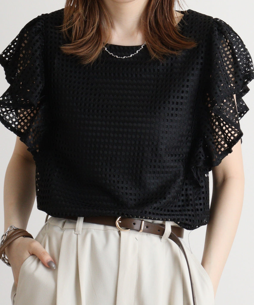 メッシュレース袖フリルプルオーバー