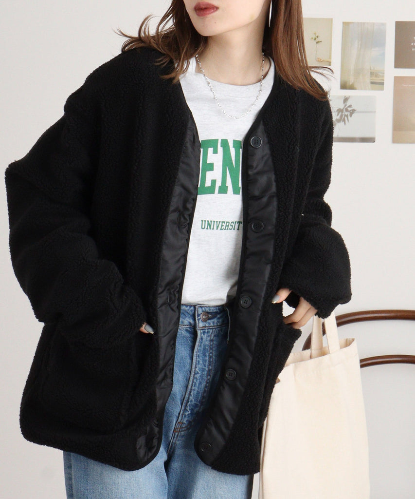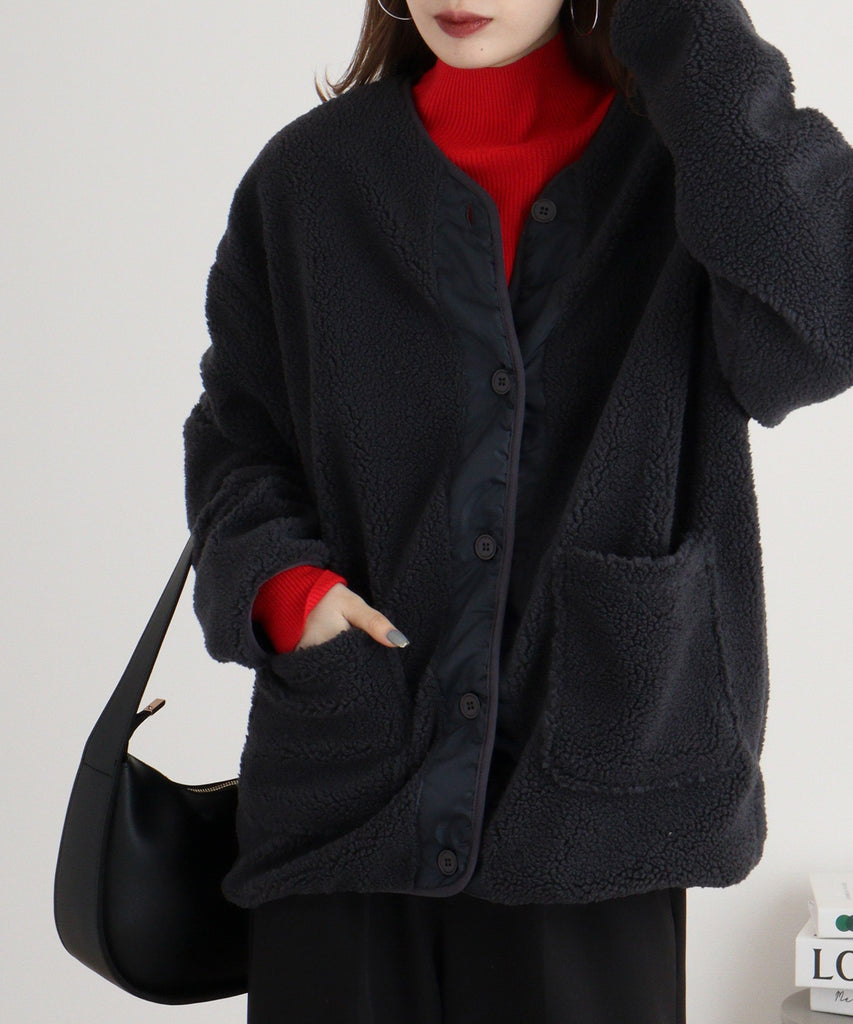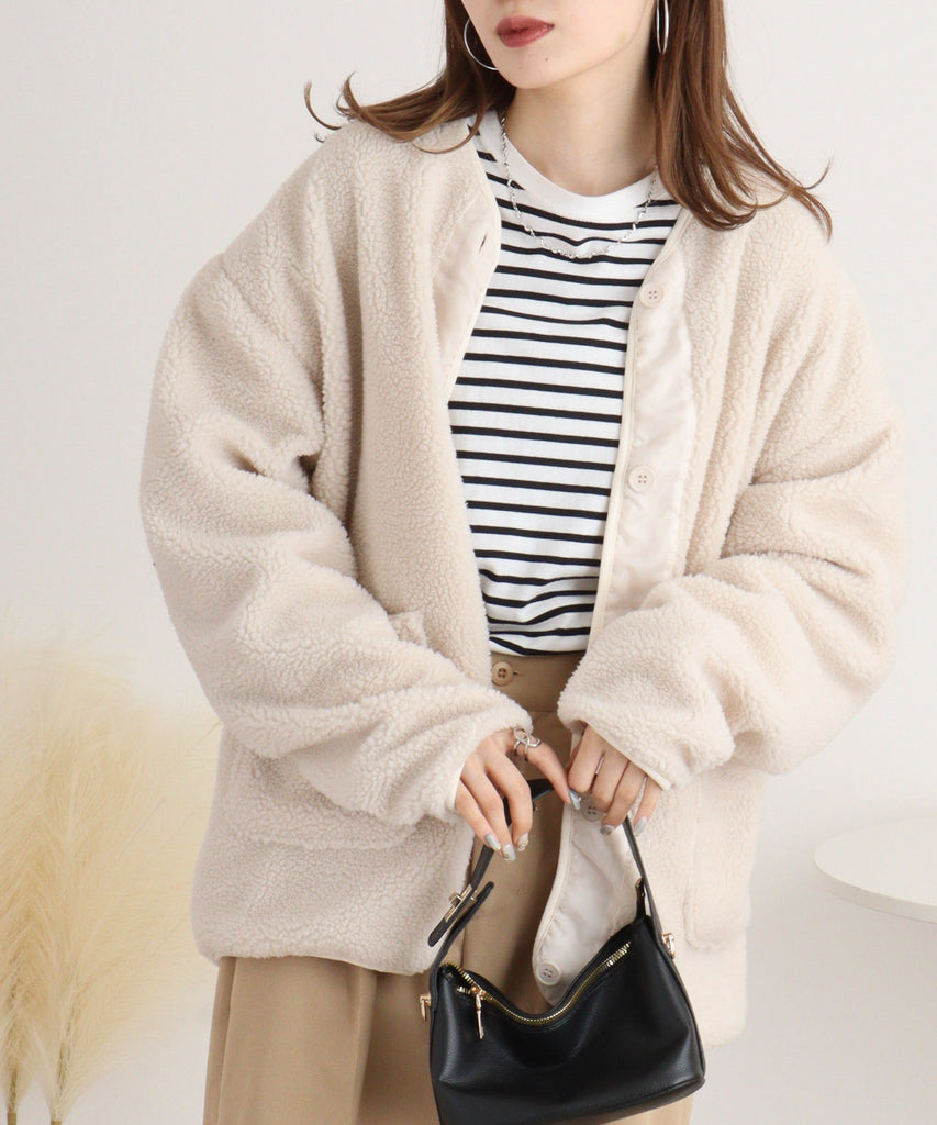 ふんわりとしたボア素材が暖かく、季節感を演出する大人のアウター。裏地付きで風を通しにくく、保温性も抜群です。