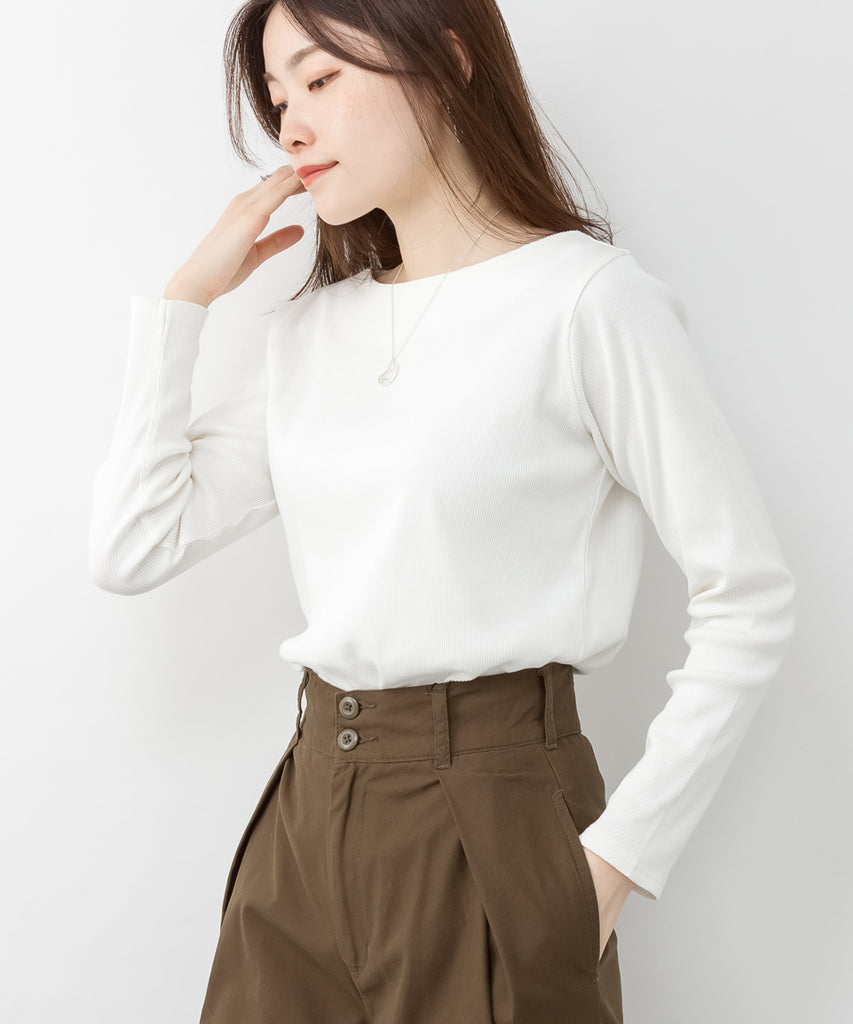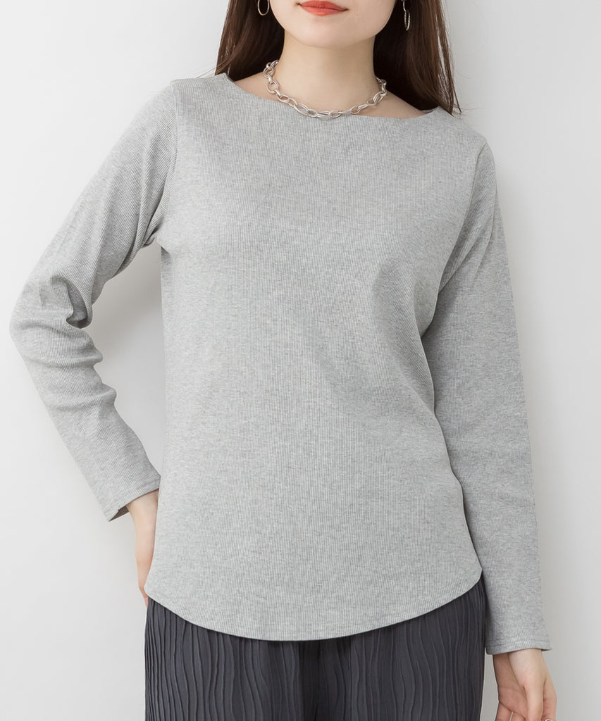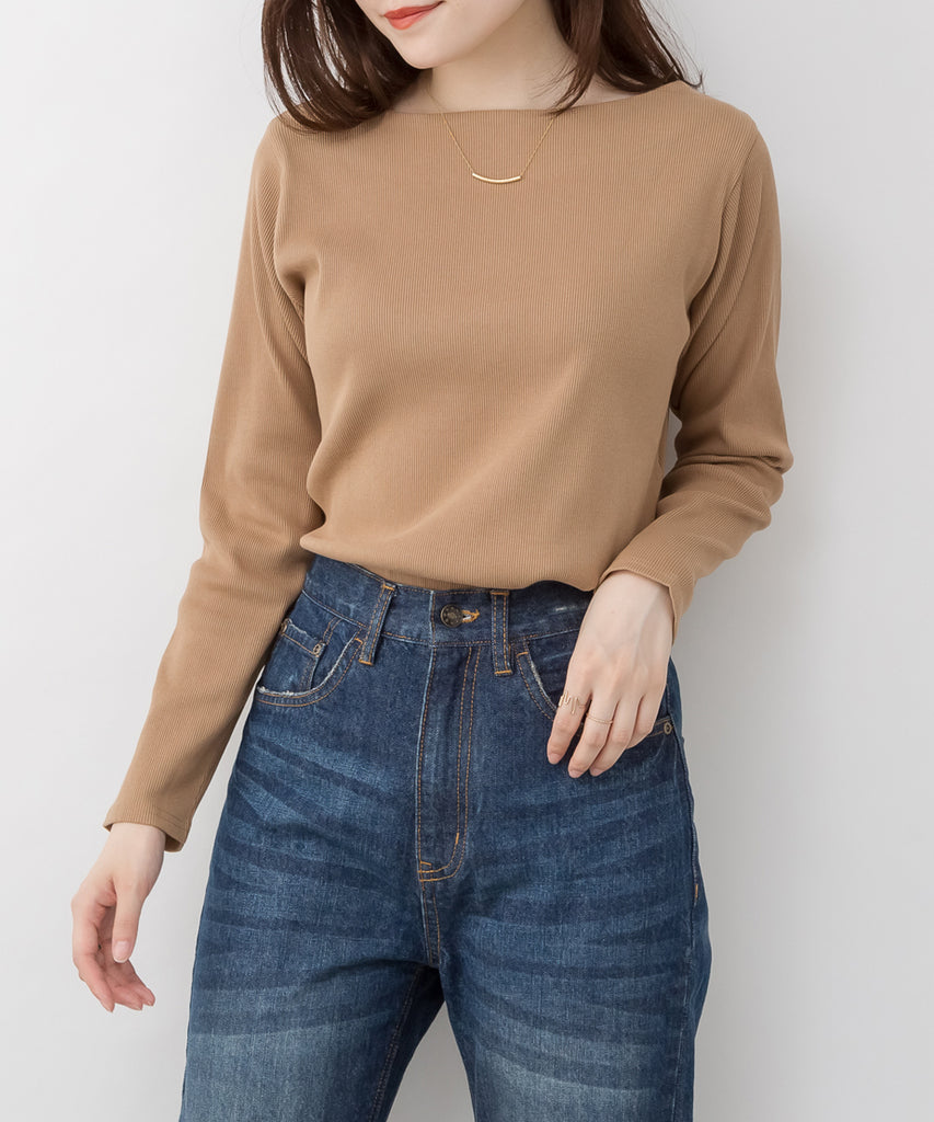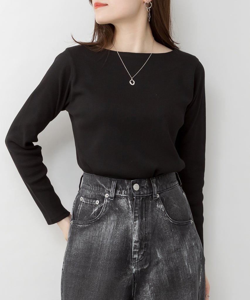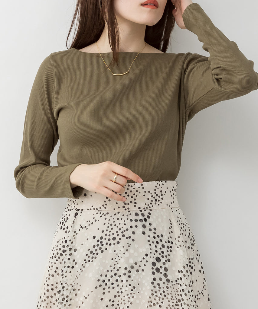 伸縮性に富んだリブ素材が体のラインを美しく映し出し、ボートネックのデザインが首元をエレガントに演出します。