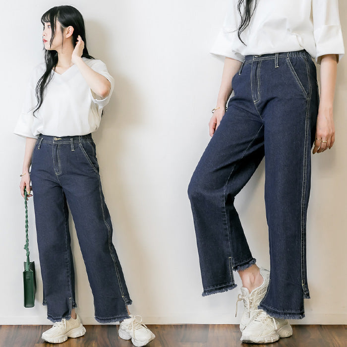 後ろ裾が短くなった前後差ある丈感が個性をプラスするデニムワイドパンツ。