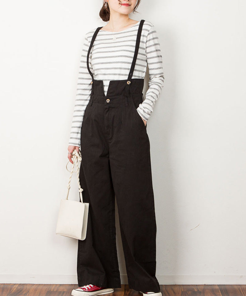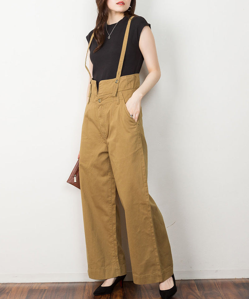 すっきり綺麗、サスペンダー付きハイウェストツイルパンツ。