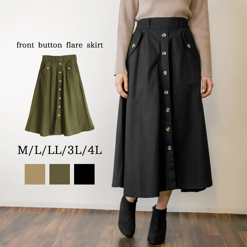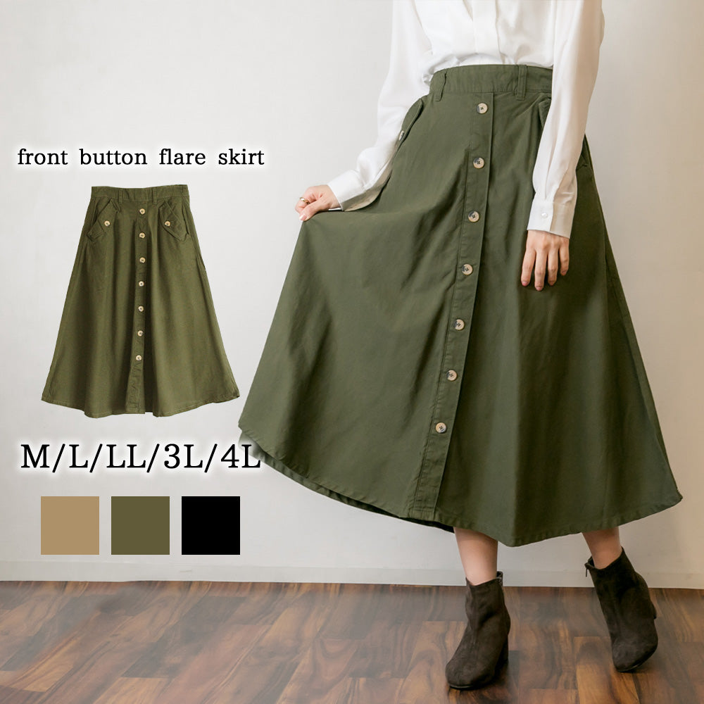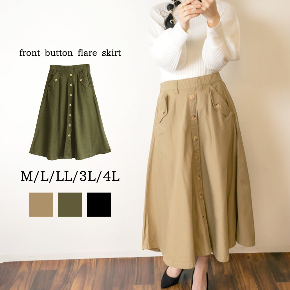 ツイルフロントボタンフレアスカート ゆったり リラックス チノ イージー オフィス 可愛い 大きいサイズ ビッグサイズ ビッグシルエット カーキ ベージュ ブラック M L XL XXL LL 3L 4L レディース 春 夏 秋 冬
