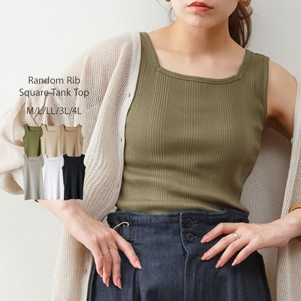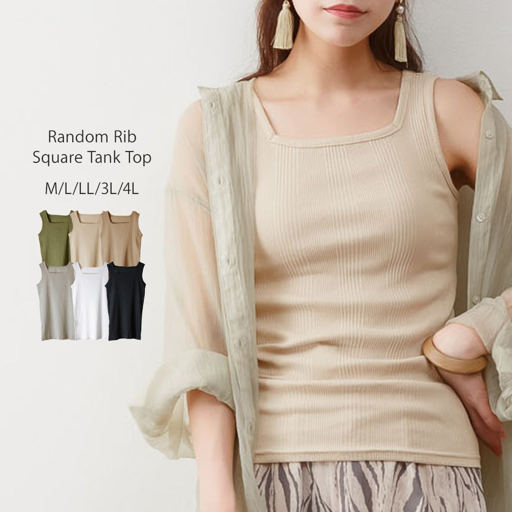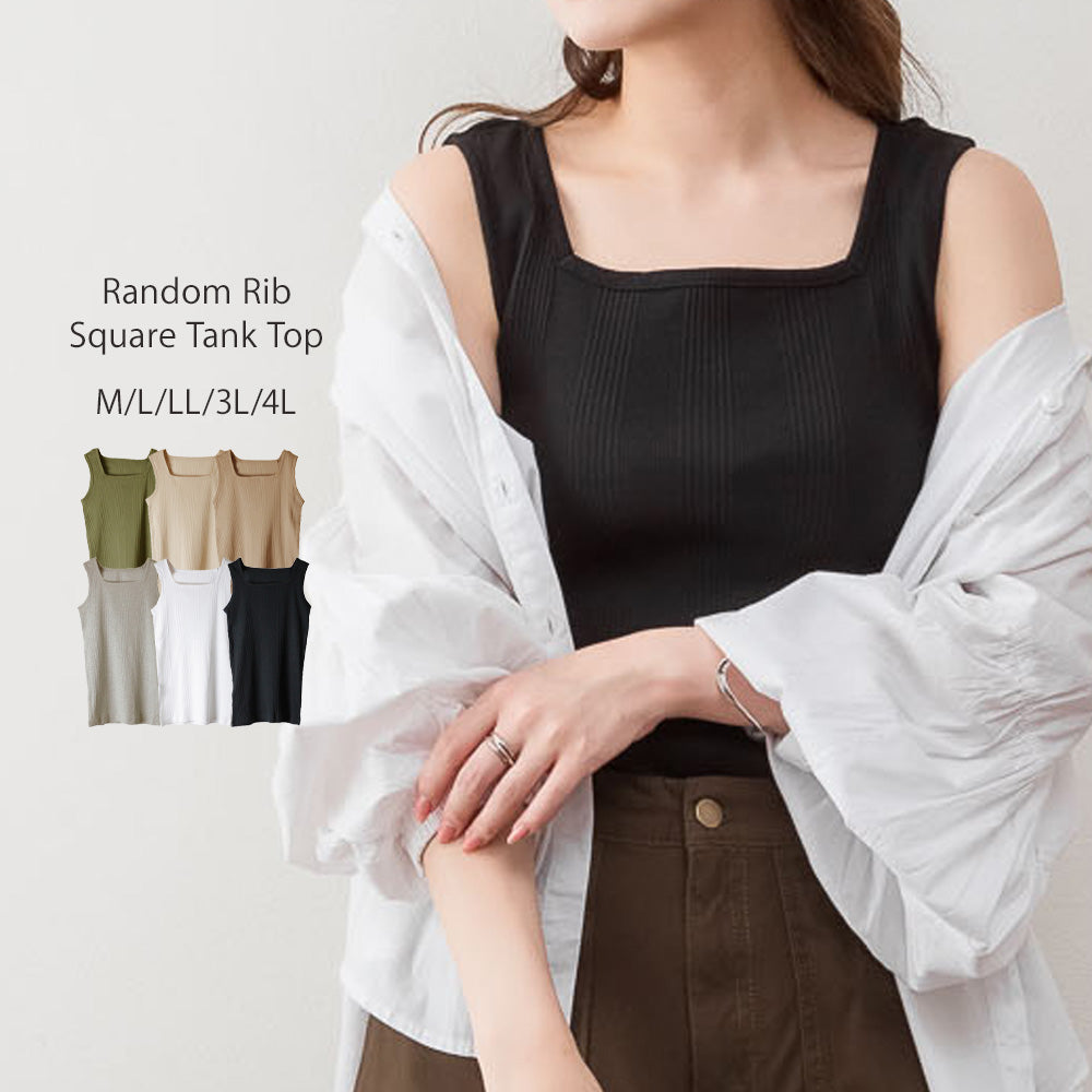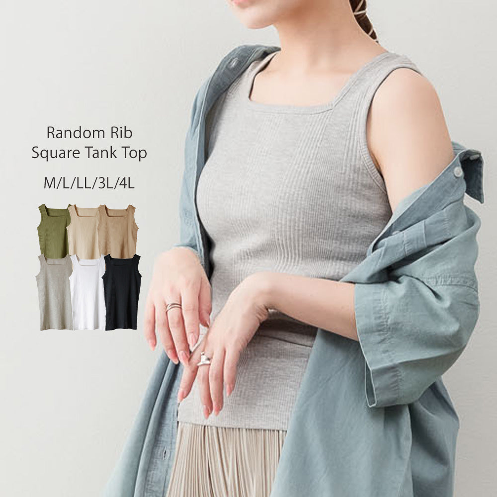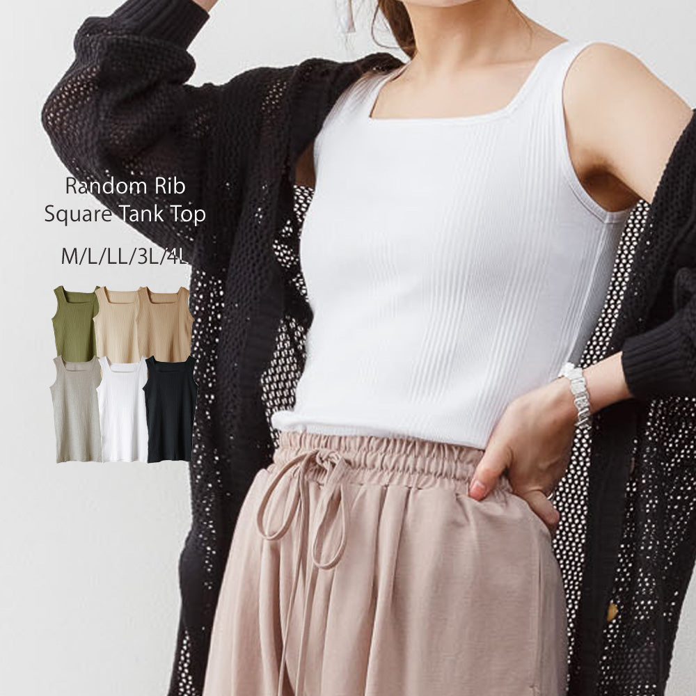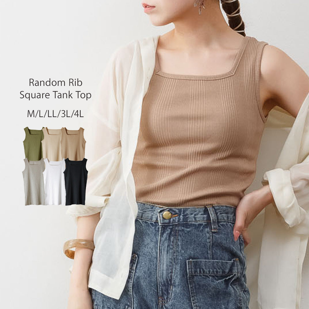 ランダムリブスクエアタンクトップ ノースリーブ 無地 カジュアル Uネック シンプル オーバーサイズ コットン クルーネック(丸首) デコルテ見せ 薄手 綿 流行 春夏 夏 新着 韓国 プチプラ