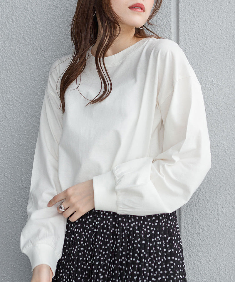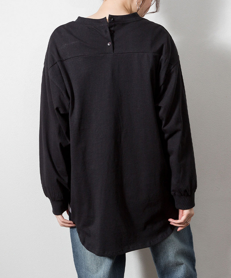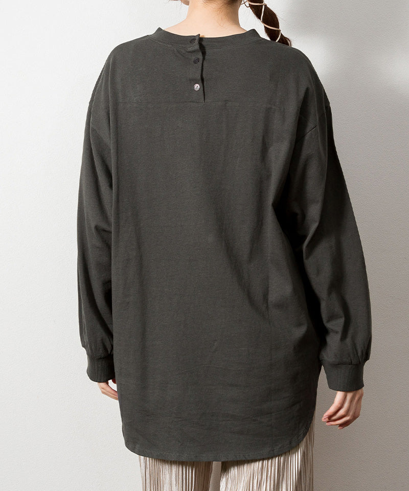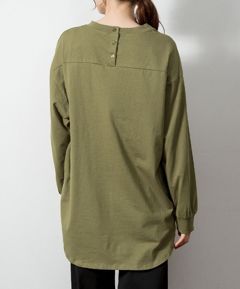 デザインはシンプルでありながら、後ろにあるボタンがアクセントになっており、後ろ姿がおしゃれに見えるようになっています。また、ロングスリーブでありながら、袖口がリブ仕様になっているため、腕周りをきゅっと引き締めてくれます。