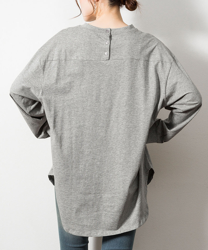 後ろボタンロングスリーブカットソーは、女性向けのファッションアイテムで、背中にボタンが付いたデザインが特徴的なロングスリーブのカットソーです。素材は柔らかくて肌触りが良く、ストレッチ性のある素材を使用しているため、着心地も快適です。