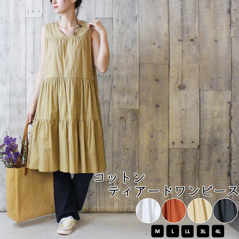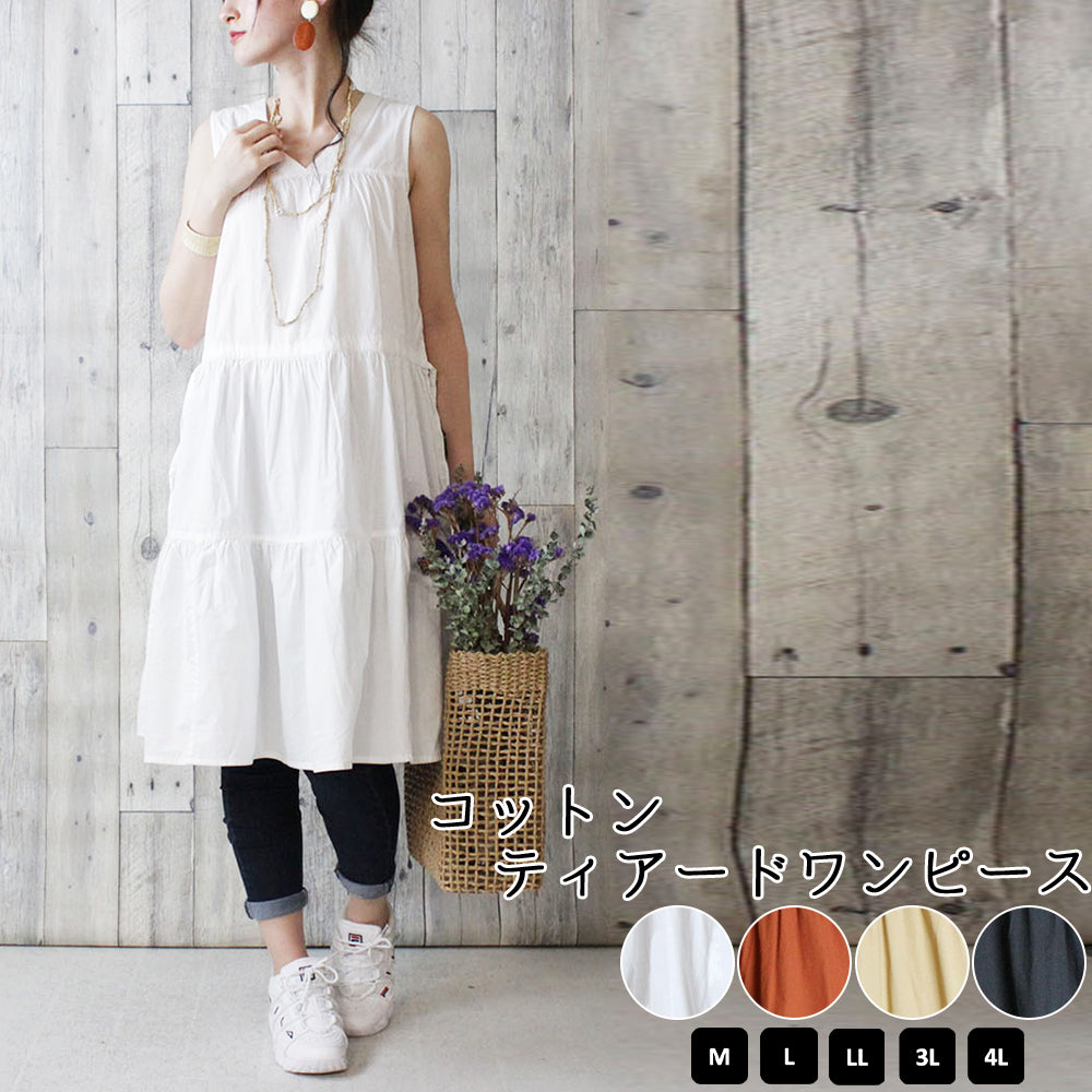 コットンティアードワンピース レディースファッション通販 M-L LL-3L 4L-5L 綿100% 夏 上品 大きいサイズ 大きめ ティアードワンピース トップス カジュアル 2way フレア 無地 ノースリVネック