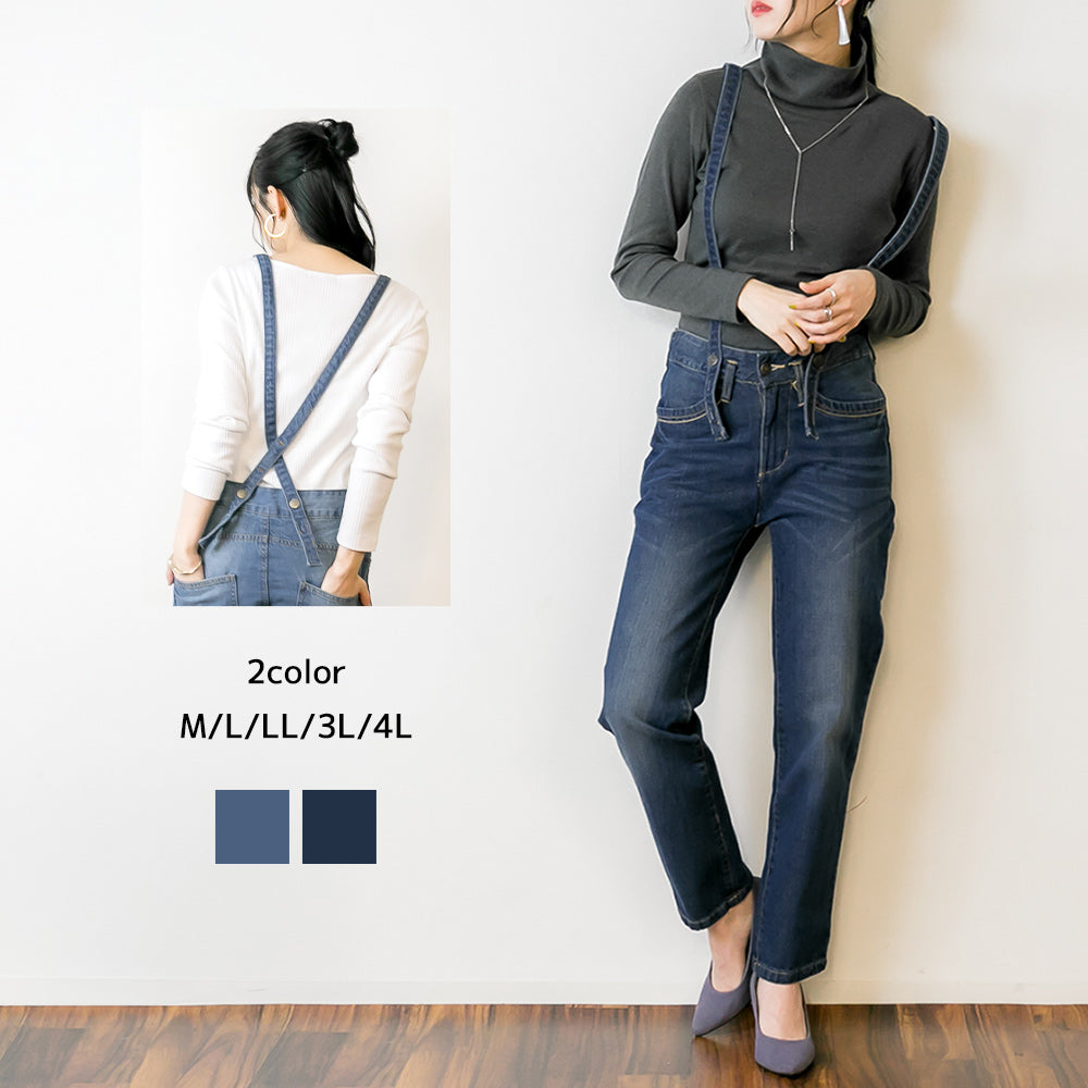 サスペンダー付きサルエルデニム 綿100% コットン ゆったり リラックス 美脚 オフィス フィット デニムパンツ 可愛い 大きいサイズ ビッグサイズ ビッグシルエット ブルー インディゴ ネイビー 青 M L XL XXL LL 3L 4L レディース 春 夏 秋 冬