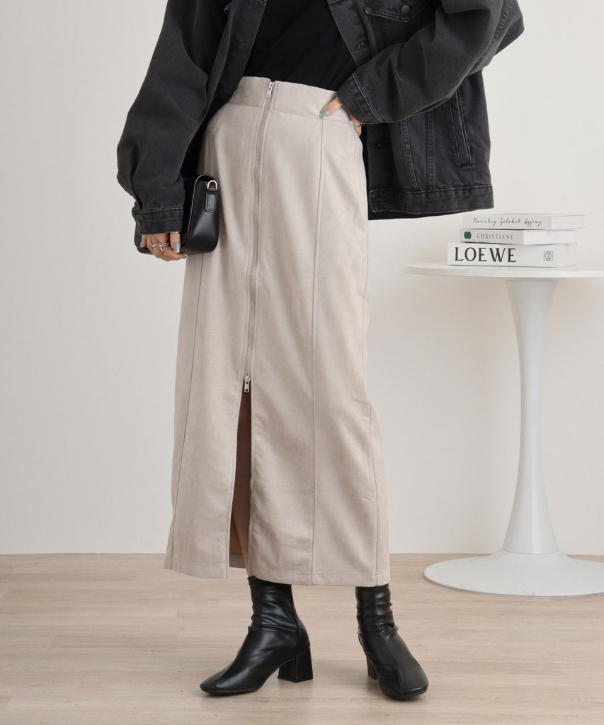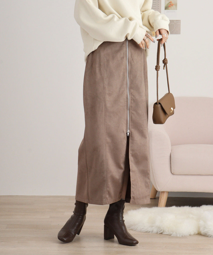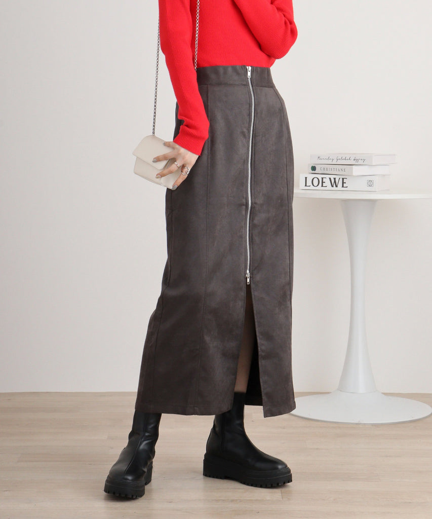 スエード調の柔らかな質感とスタイリッシュなダブルジップデザインが魅力のスカート。