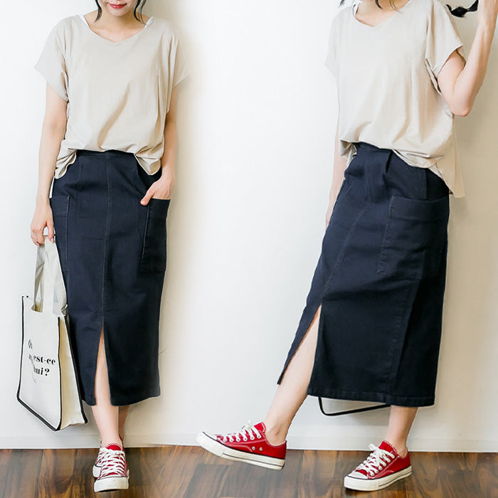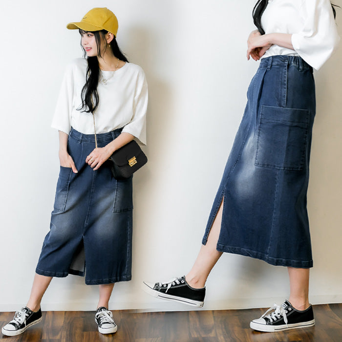 ストレッチデニムビッグポケットタイトスカート レディースファッション通販 スカート ストレッチ タイトスカート デニム スカート 無地ロング丈 M L LL 3L 4L レディース 春夏秋冬 楽ちん 大きいサイズ ウエストゴム カジュアル 体型カバー シンプルリラックス お洒落
