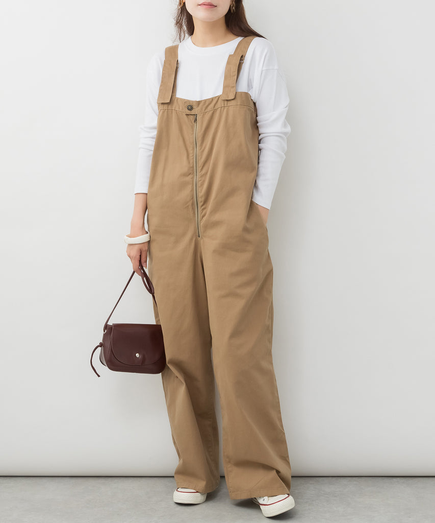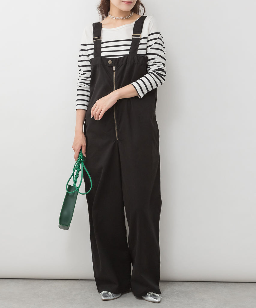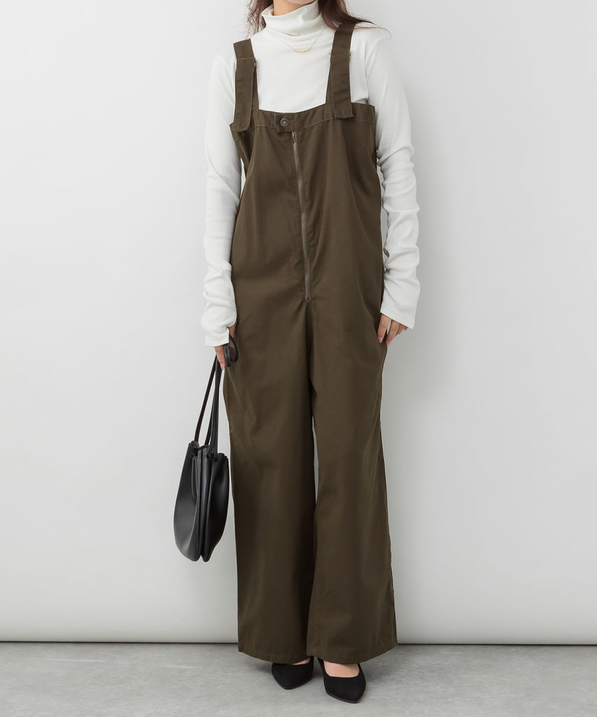 着脱しやすいようにするセンタージッパーをあえて見せることで、デザインポイントとしたハイウェストサロペットパンツ。