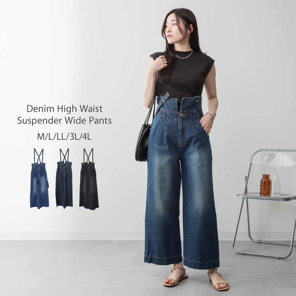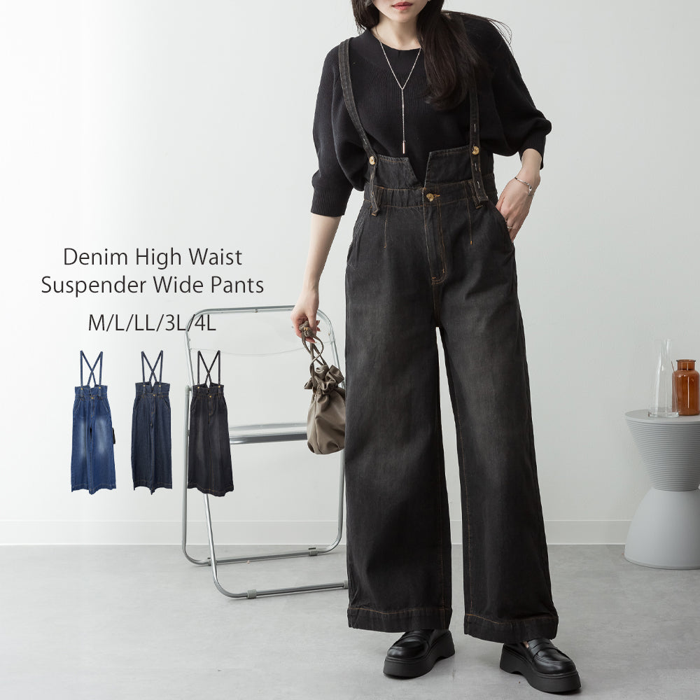 1枚持っていると便利 サスペンダー付きデニムハイウェストワイドパンツ"