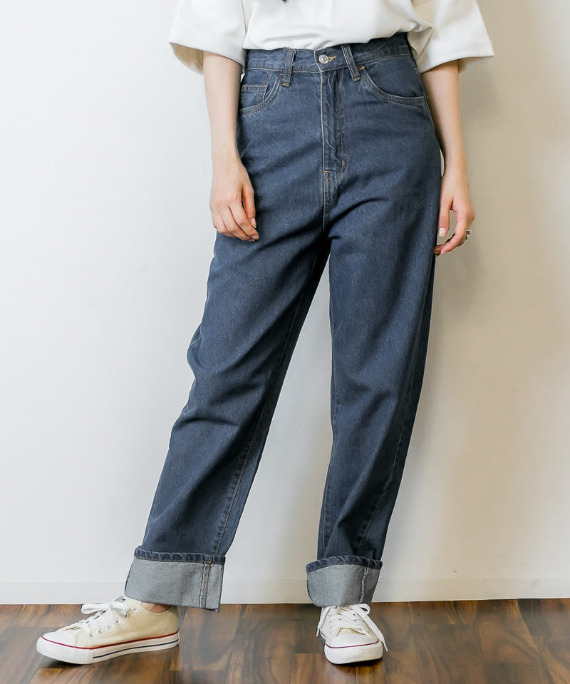 大胆な折り返しデザインが印象的なロールアップデニムパンツ