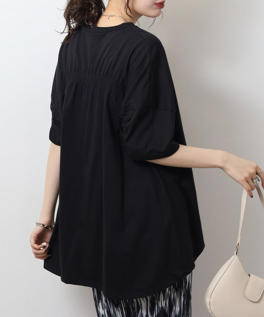 背中のギャザーデザインが後ろ姿までおしゃれに見せてくれます。
