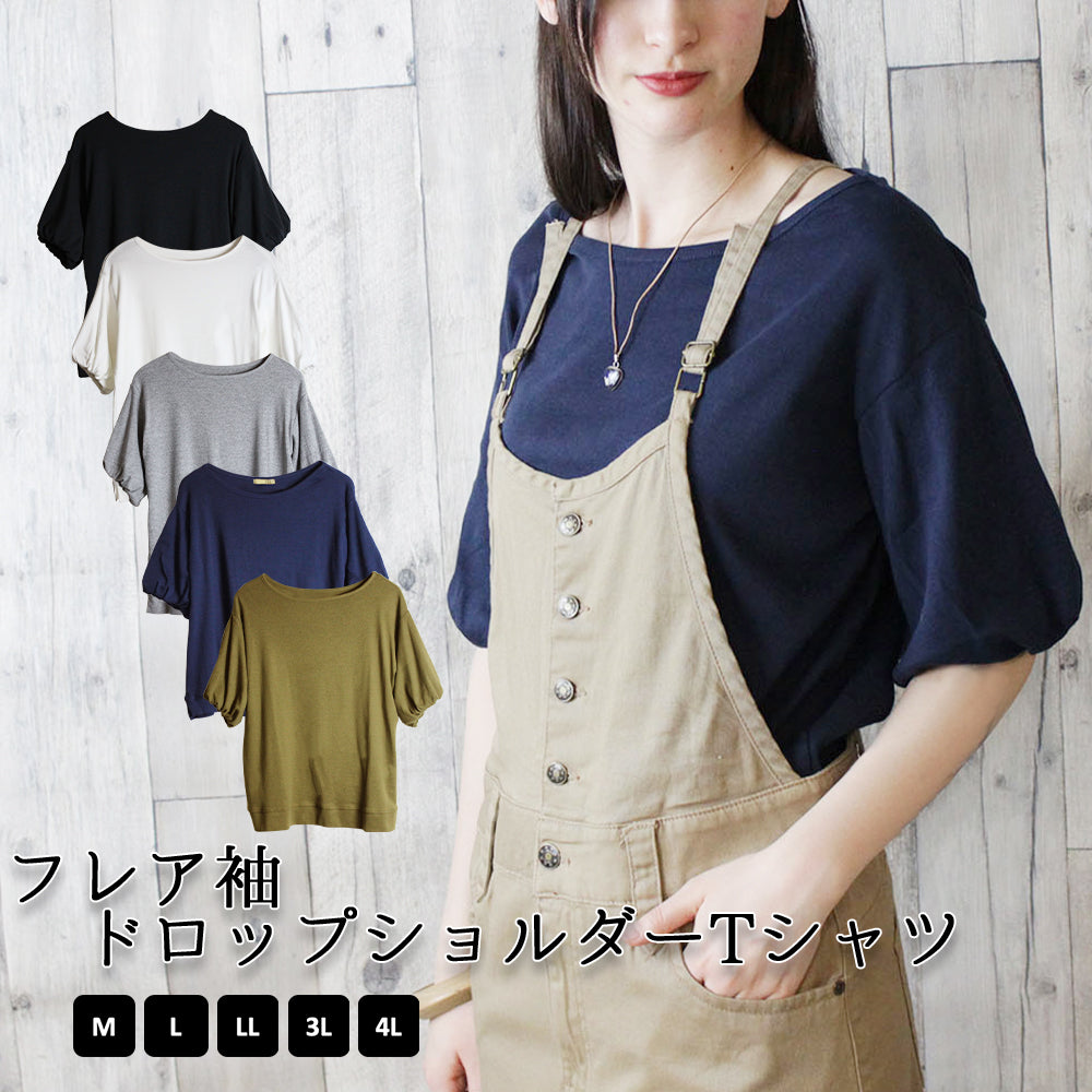 フレア袖ドロップショルダーTシャツ パフ ハーフ スリーブ カットソー 半端袖 半袖 ユーネック丸首 Tシャツ 春コーデ レディース カジュアル 綿 ビッグサイズ 体型カバー ビッグシルエット 大きいサイズ かわいい きれい M/L/LL/XL/XXL/3L/4Lサイズ 春 夏 秋