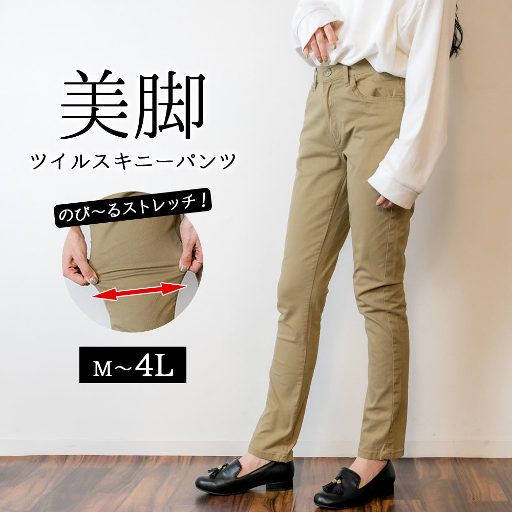 フロントジッパーツイルスキニーパンツ スリム ゆったり リラックス 美脚 伸縮 伸び チノパンツ イージーパンツ オフィス 可愛い 大きいサイズ ビッグサイズ ビッグシルエット カーキ ベージュ ブラック M L XL XXL LL 3L 4L レディース 春 夏 秋 冬