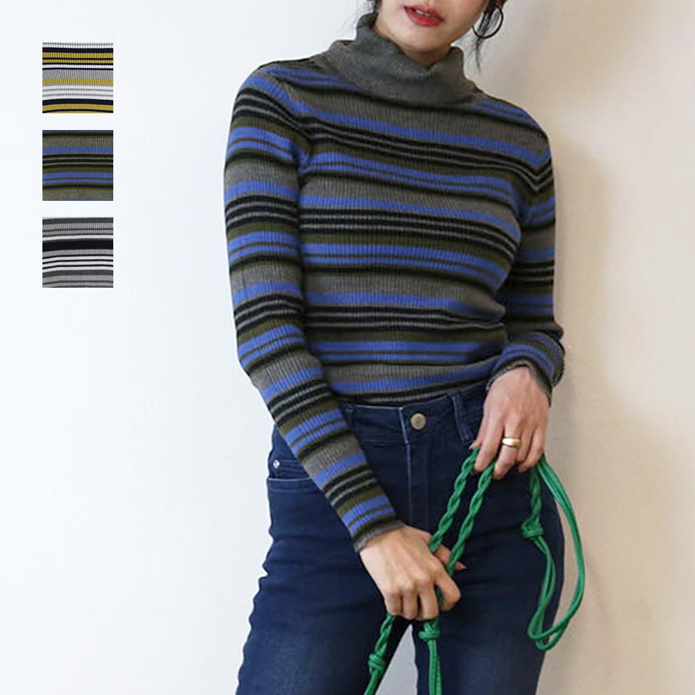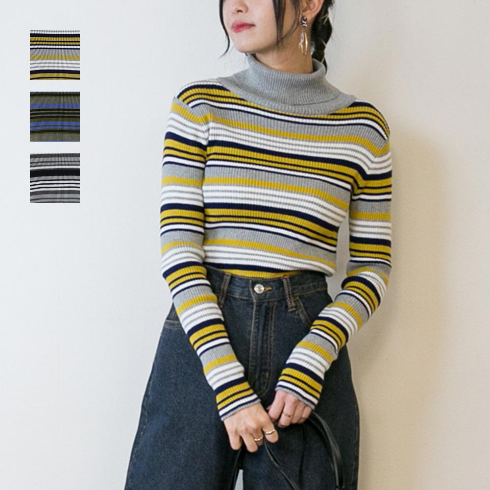 ボーダーが印象的なタートルリブニット。