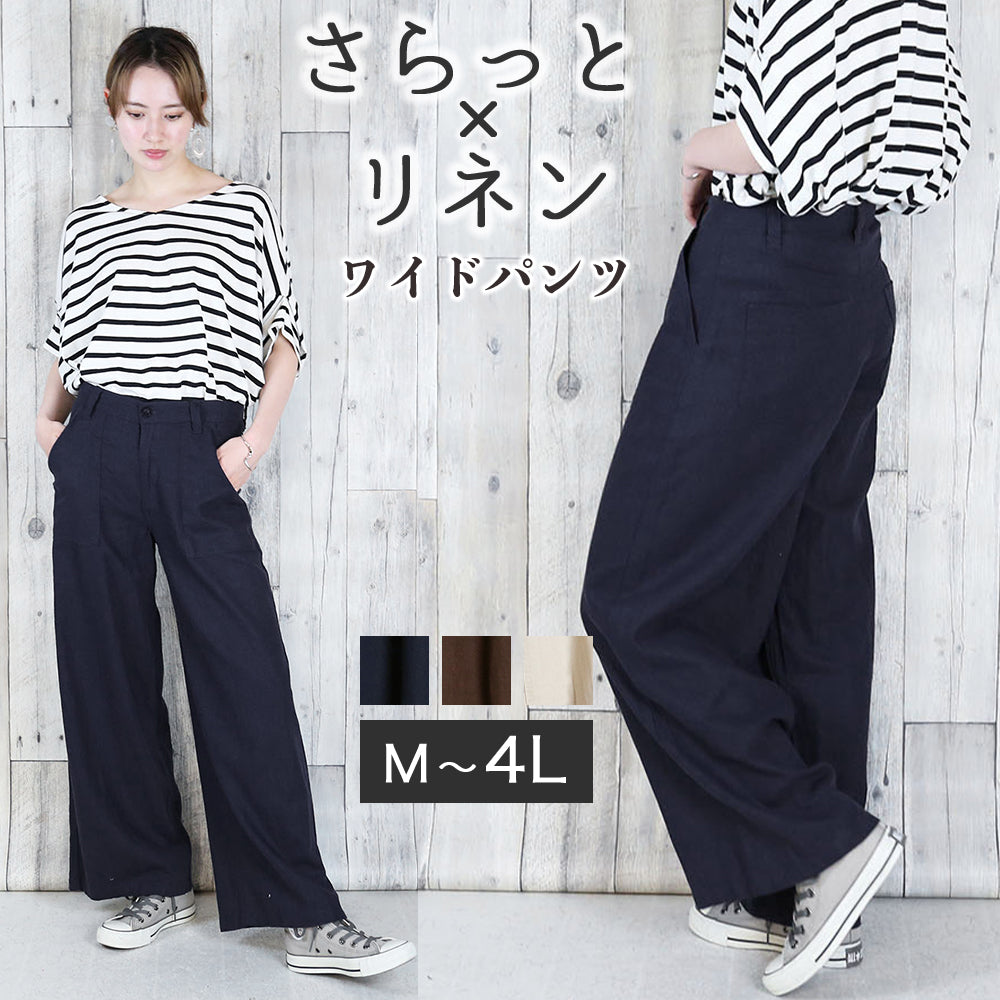 リネンベイカーワイドパンツ レディースファッション通販 M L LL 3L 4L リネン ワイドパンツ ボトム 大人 ベイカーサイドポケット ゆったり 大きいサイズ 大きめ