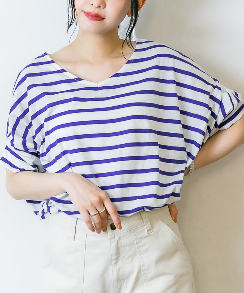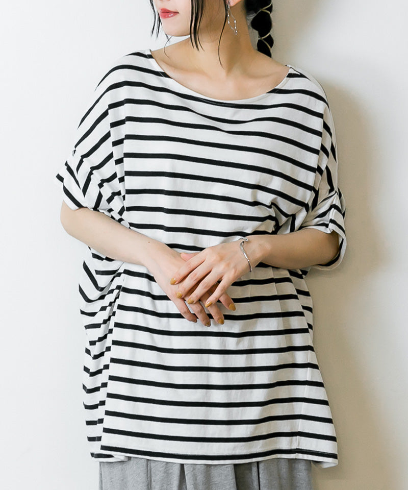 ゆったりした身幅が切り替えラインですっきりと細見えするシルエット春夏にぴったりの爽やかボーダー柄で、 抜け感のある大人のマリンスタイルへデイリー使いに最適な優秀アイテムどんなボトムスとも相性良く着まわし力も抜群