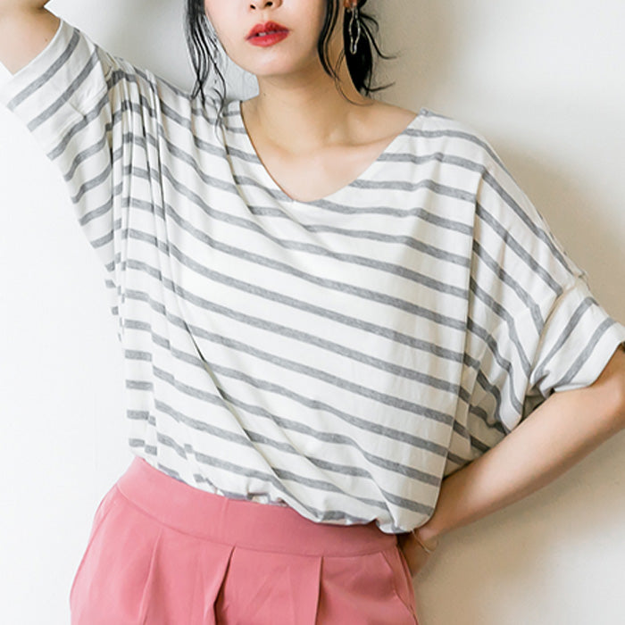 変形ドルマンボーダーカットソー レディースファッション通販 変形ドルマンワイドカットソー M-L LL-3L 4L-5L 無地 大きいサイズ 大きめ リラックス ゆったり ラクチン 体型カバー お洒落 カジュアル ゆるシルエット ボーダー