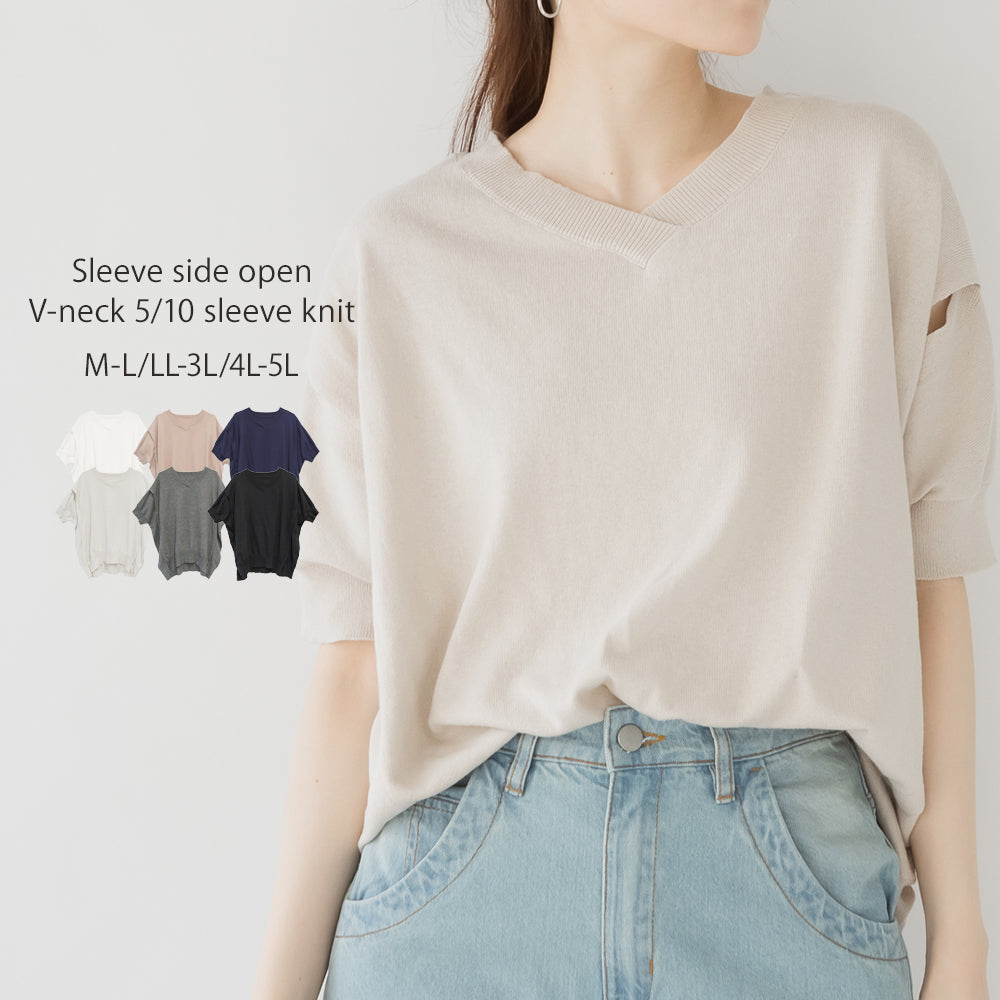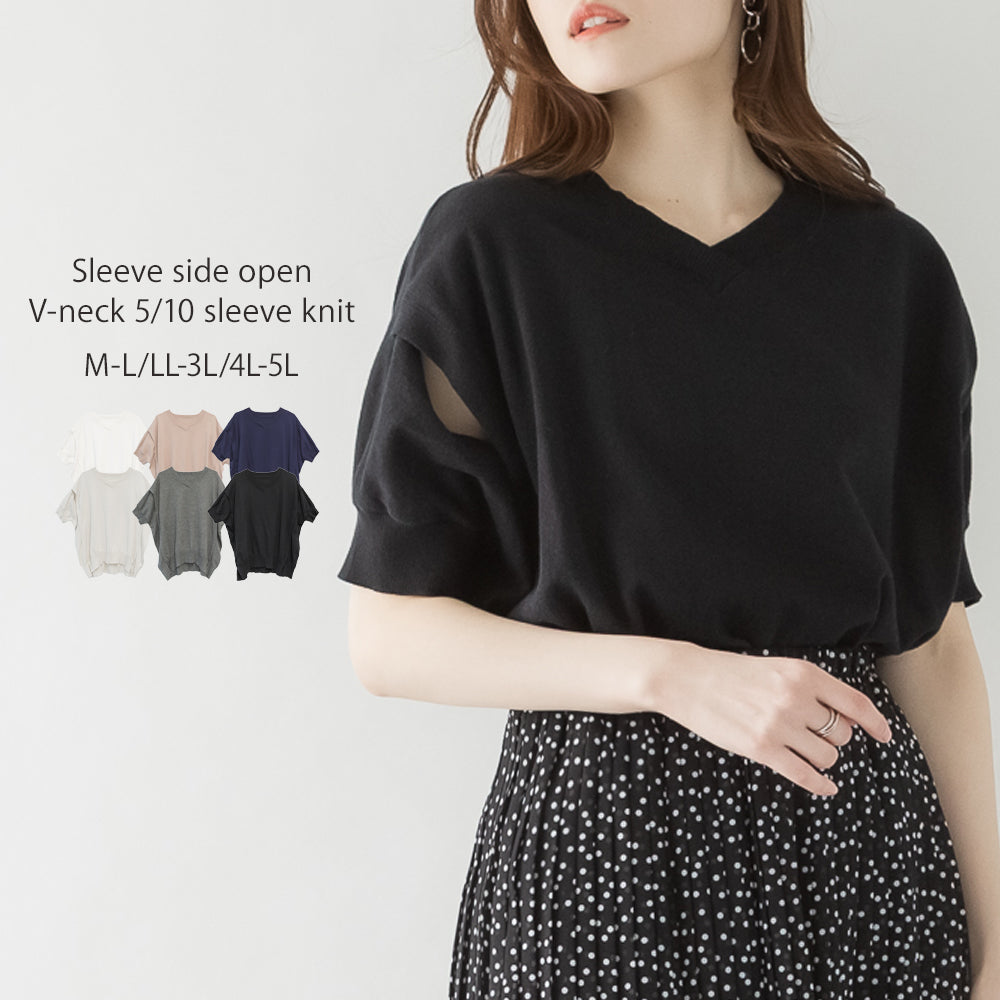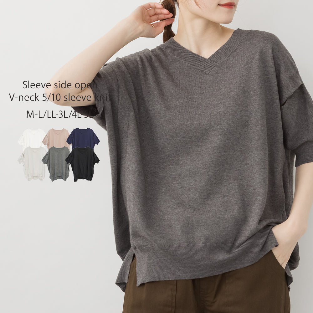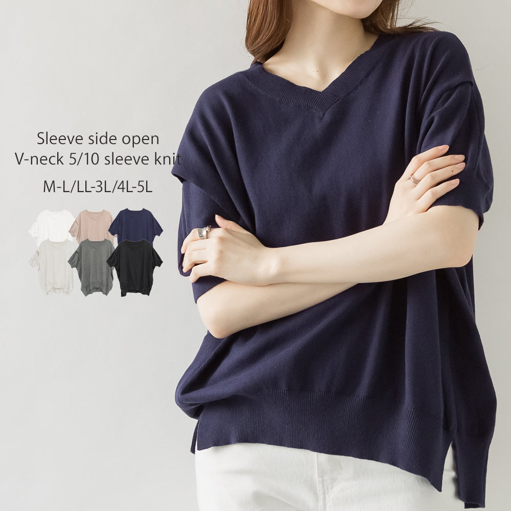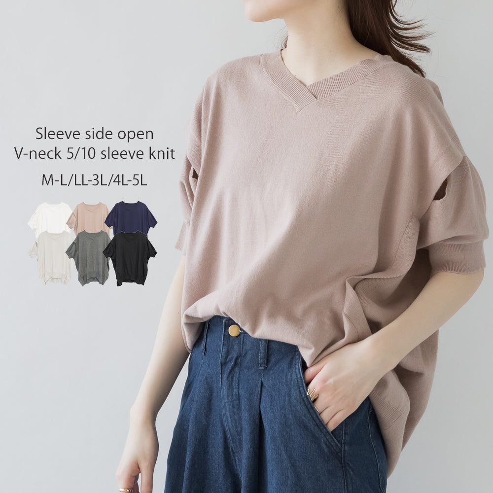 袖脇オープンVネック5分袖ニット
