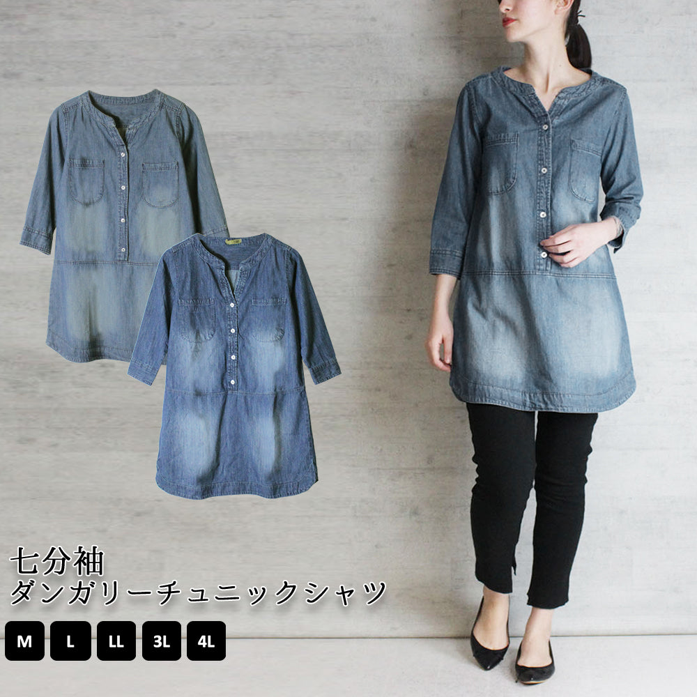 7分袖ダンガリーチュニックシャツ 綿100% トップス プルオーバー ゆったり リラックス オフィス デザイン 可愛い 大きいサイズ ビッグサイズ ビッグシルエット ブルー インディゴ ネイビー 青 M L XL XXL LL 3L 4L レディース 春 夏 秋 冬