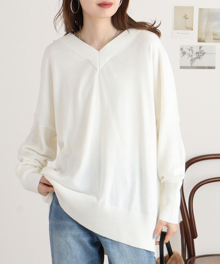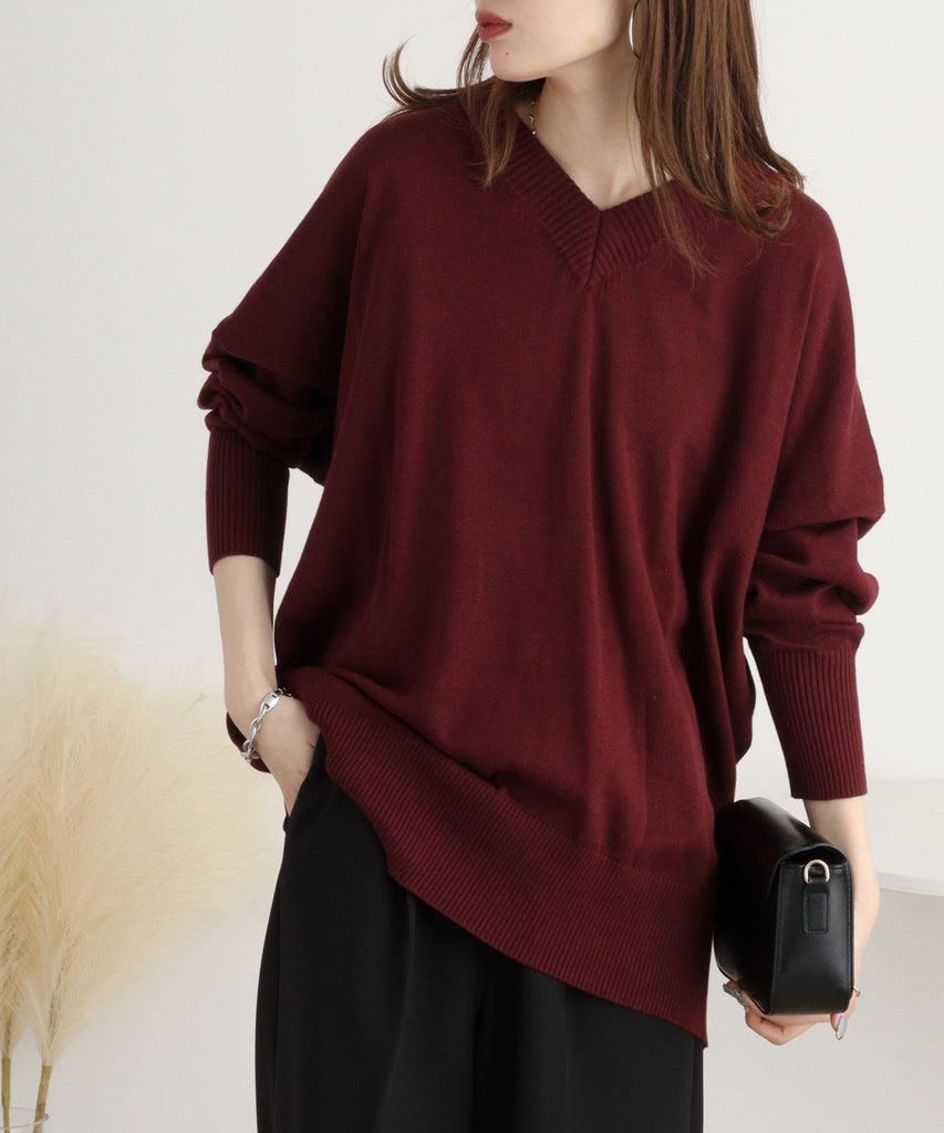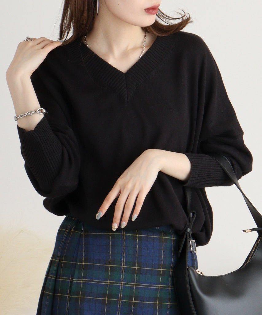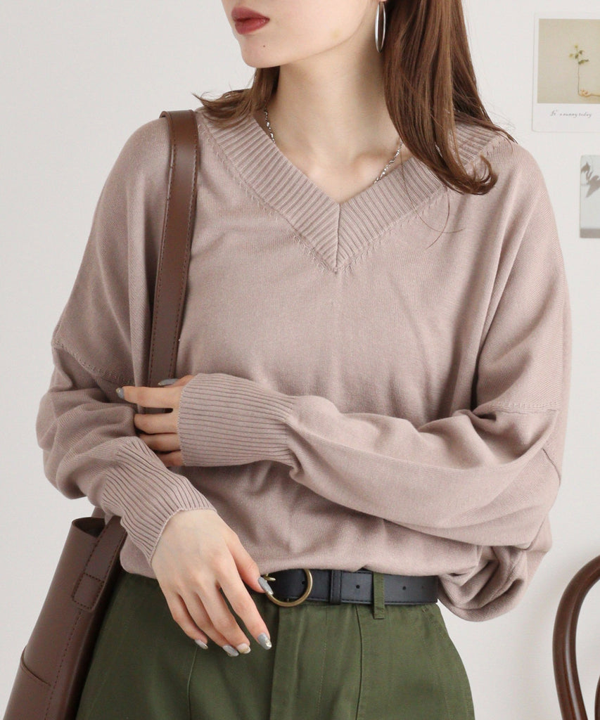 Vネックデザインとリブディテールが印象的なドルマンセーター。袖と襟元に施されたリブ編みがモダンな雰囲気を演出し、洗練されたスタイルを完成させます。